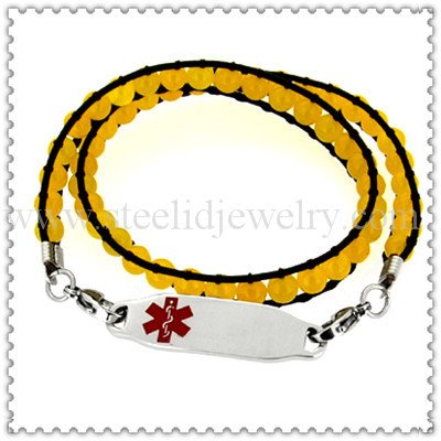 It is made with beads, leather, and stainless steel lobster clasps and an ID tag, the bracelet should wrap around the average-sized arm two times.
