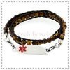 This bracelet is made with beads, leather, and stainless steel lobster clasps and ID tag, the bracelet should wrap around the average-sized arm two times.