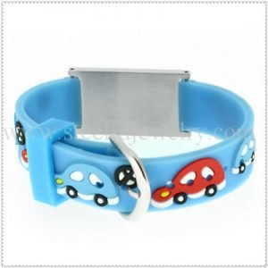 14mm rubber bands with 3/4″ W x 1″ L medical id plaques, 195mm length, 1 size suit for all ages kids.
