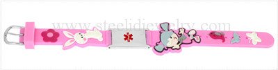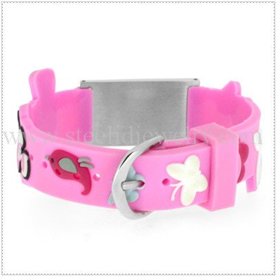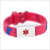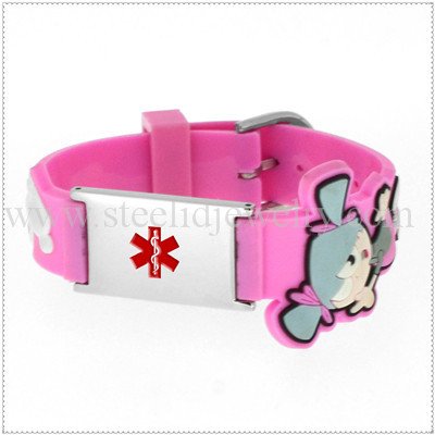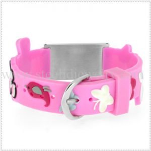 14mm 3D pink color rubber bands with 3/4″ W x 1″ L medical id plaques, 195mm length, 1 size suit for all ages kids.