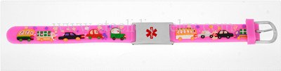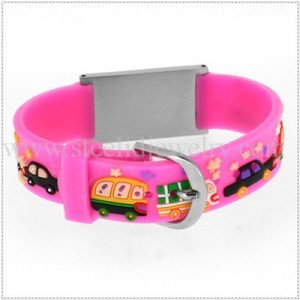 14mm 3D cute pink color rubber bands with 3/4″ W x 1″ L medical id plaques, Five lines of personalized engraving. 195mm length.