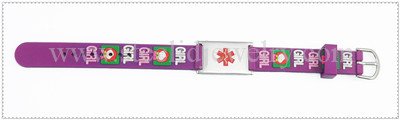 Rubber purpler band with cartoon lovely girls, all the girls love this style. 316L stainless steel plaques with red charm, durable and waterproof.