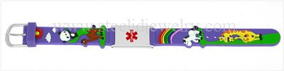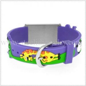 Adjustable, watch-style PVC Band with stainless steel plate and buckle, Hyacinthine color bands with tap zoo patterns, all the kids will like it.
