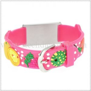 The peach color rubber band medical alert bracelet with fruit— Banana, orange, strawberry, watermelon …
