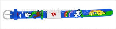 14mm 3D navy blue color rubber bands with 3/4″ W x 1″ L medical id plaques, Five lines of personalized engraving. 195mm length.