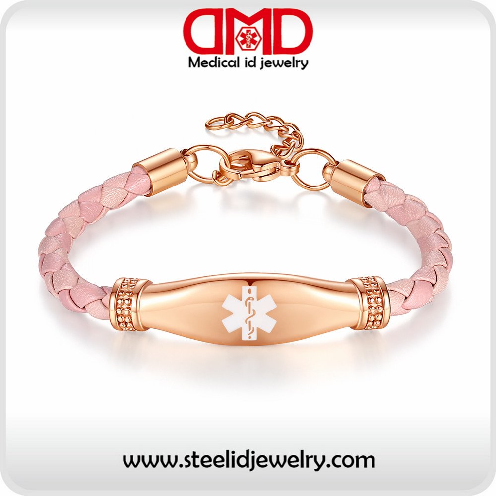 Leather Stainless steel Medical id bracelets for Women-MD1199RGPK