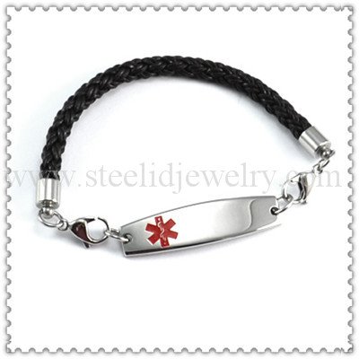 6mm braid leather bands, 11.5mm*45mm steel medical id plaques, 7.5″~8.5″ length, can be customized.