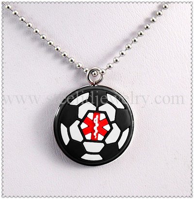 Stainless steel & black rubber soccer ball medical ID pendant necklace. Nice choice for the kids who love sports.