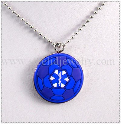 Stainless steel & blue rubber soccer ball medical ID pendant necklace. Nice choice for the kids who love sports.
