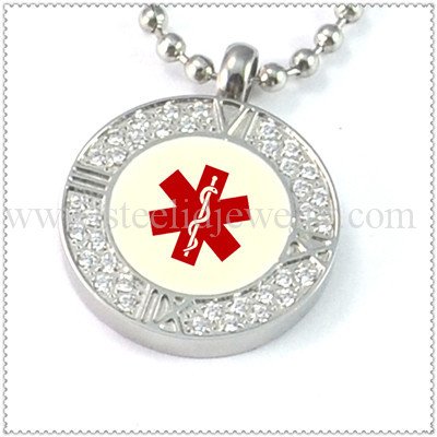26MM diameter medical id pendant, with bling clear crystals, can engrave/ laser on back side only, weight about 21 grams.